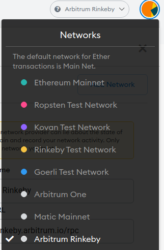 Finally select the Arbitrum Rinkeby in Metamask's network selector (drop down at the top of Metamask):